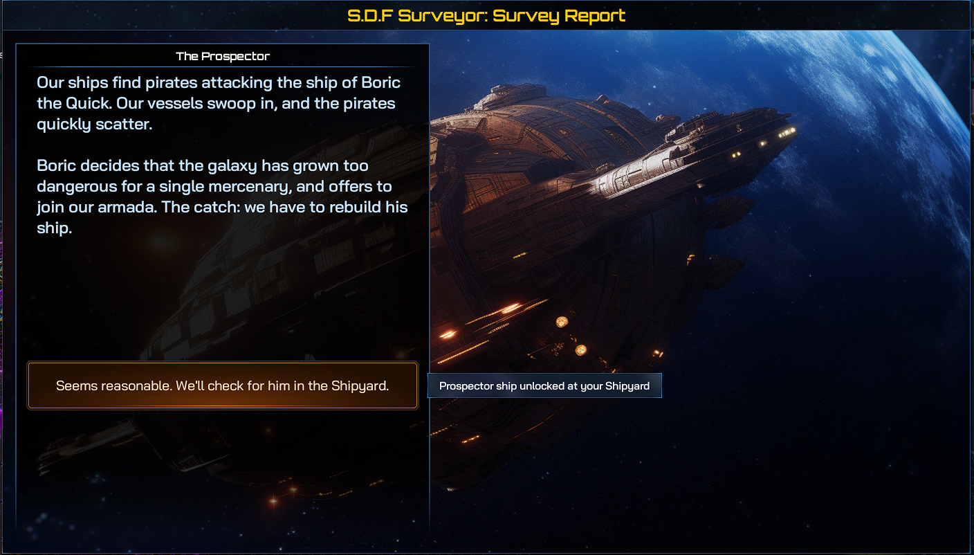 I am playing a new game under 1.55.376894.1 and I supposedly unlocked Boric the Quick's Prospector ship (first screen snapshot below). However, when I look in my shipyard, the ship is nowhere to be found (second screen snapshot below).